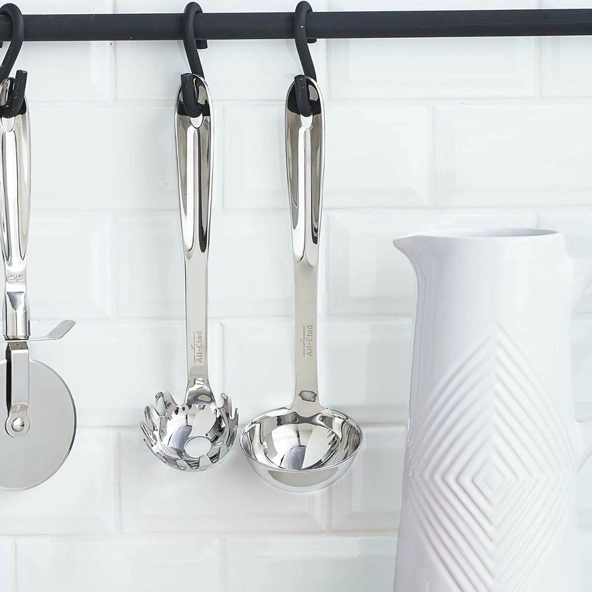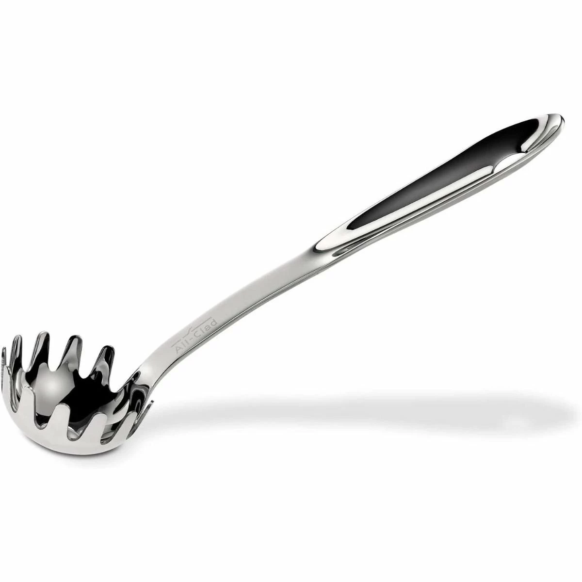 The original stainless tool collection was designed to complement All-Clad cookware. The pasta ladle has large holes to promote quick draining. The prongs grip noodles while cooking or serving pastas of all shapes and sizes.