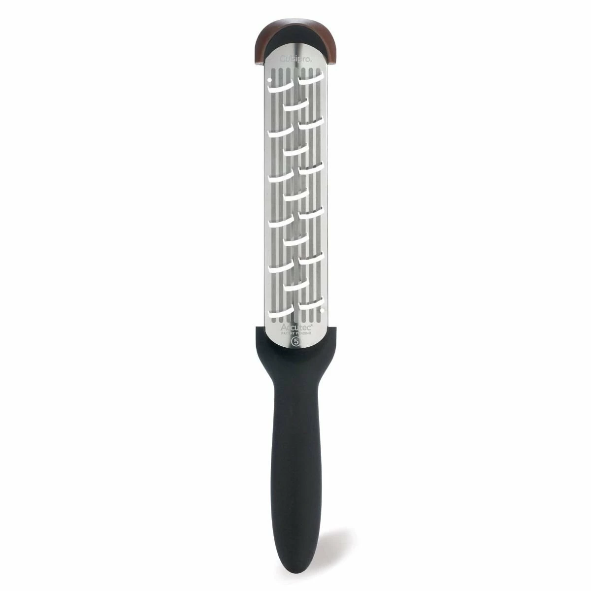 Featuring Cuisipro’s unique Surface Glide Technology, the Cuisipro Shaver Rasp Grater enables you to quickly and easily shave the peel off of root vegetables like potatoes, carrots, parsnips, and beets! Shallow grooves along the double-sided acid-etched cutting surface reduce resistance and extend blade length providing more cuts with each pass so you can get more done with less effort. An ergonomic handle design offers comfort and control while the non-slip foot provides stability when grating on countertops or cutting boards. With a durable steel frame surrounding the stainless steel cutting surface, the Coarse Rasp Grater is sturdy enough for a wide range of grating tasks. The clear plastic protective cover slides on the grater for safe storage, but can also be reversed to collect and measure food while you are grating so you always get just the right amount. Dishwasher safe, but hand-washing is recommended.