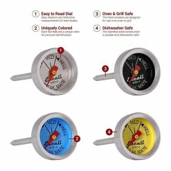 - Features a tight-sealing lid with built-in color-coded thermometer