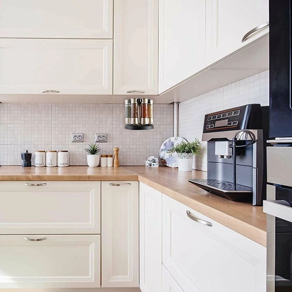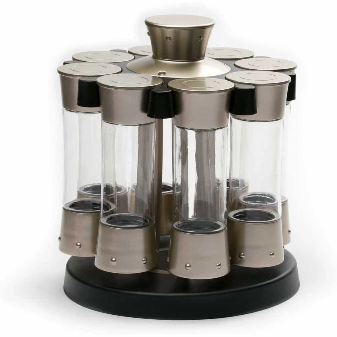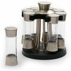 Explore a range of spices and flavors and keep them handy with the Fox Run KitchenArt Auto Measure Professional Carousel Spice Rack (Satin)! And always get the right amount for any recipe with the convenient auto measure feature that lets you dispense the spices in 0.25-tsp increments with a simple click. The jar lids can be set to shake or pour and the eight plastic 3.5oz jars are easily refillable. The rotating base provides quick access to all the spices and the entire carousel can be double stacked or mounted to the underside of your upper cabinets to free up counter space. To clean and maintain, all components should be hand washed. Spices not included.