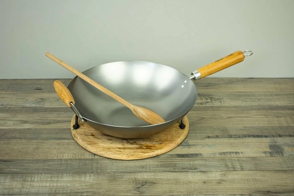 The traditional beauty of rustic carbon steel for quick heat response and uniform heating, coupled with 100% sustainable bamboo heat resistant handles, with both beauty and functionality so your family’s next stir fry will be tasty & served with class and style when you use the Helen’s Asian Kitchen 14” Wok. The flat bottom sits securely on any stovetop. This 14” wok is also very versatile, you can use it to make stir fry of course, but also, stew, saute, deep fry, braise and so much more. You won’t know how you ever managed without this in your cookware collection once you try it!