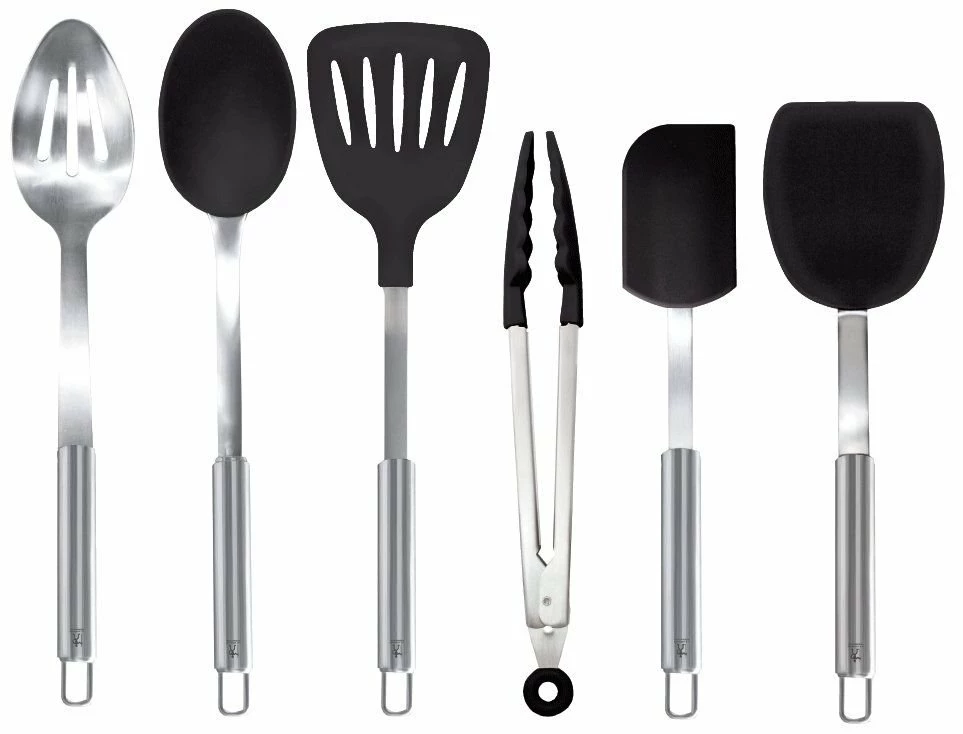 Equip your kitchen with durable, attractive kitchen tools. The Zwilling J.A. Henckels International 6pc Kitchen Tool Set has tools made from gorgeous brushed 18/10 stainless steel with black silicone-coated tips to help grasp food securely and resist scratching cookware. Each item in this 6-piece set has a hanging loop on the top of the handle for easy storage and access. Thanks to the stainless-steel construction you will have durable, quality cookware for years to come from the fine folks at Zwilling J.A. Henckels.