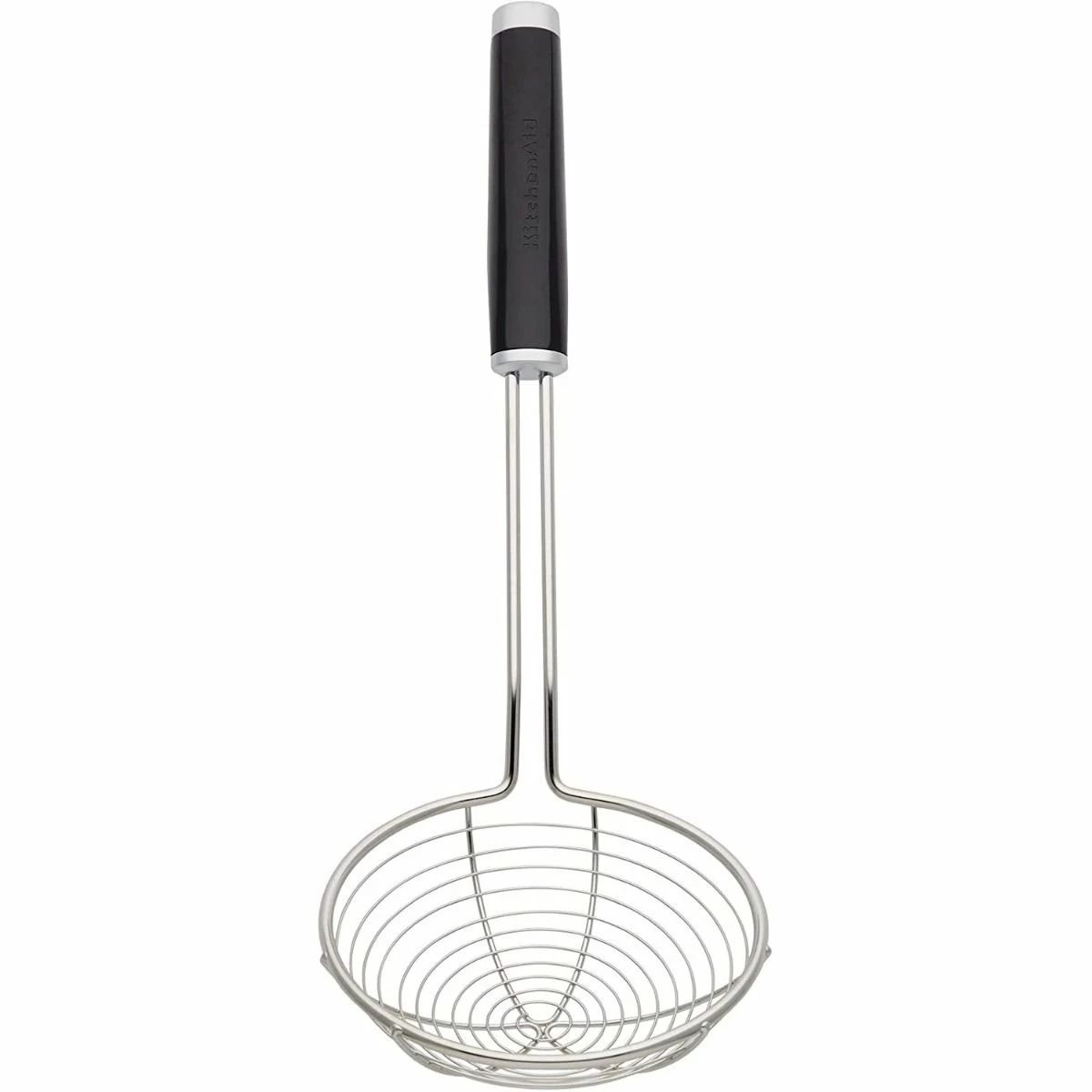 Frying has never been easier or safe than with the KitchenAid Classic Black All-Purpose Strainer. This strainer is designed with a long handle that is set back from the stainless steel basket, keeping your hands away from hot oil or boiling water. The stainless steel strainer is extremely durable with an ergonomic handle that is easy to use in your right or left hand. This rust-resistant strainer is great for countless recipes from frying to boiling and everything in between. Get the KitchenAid Classic Black All-Purpose Asian Strainer today!Â