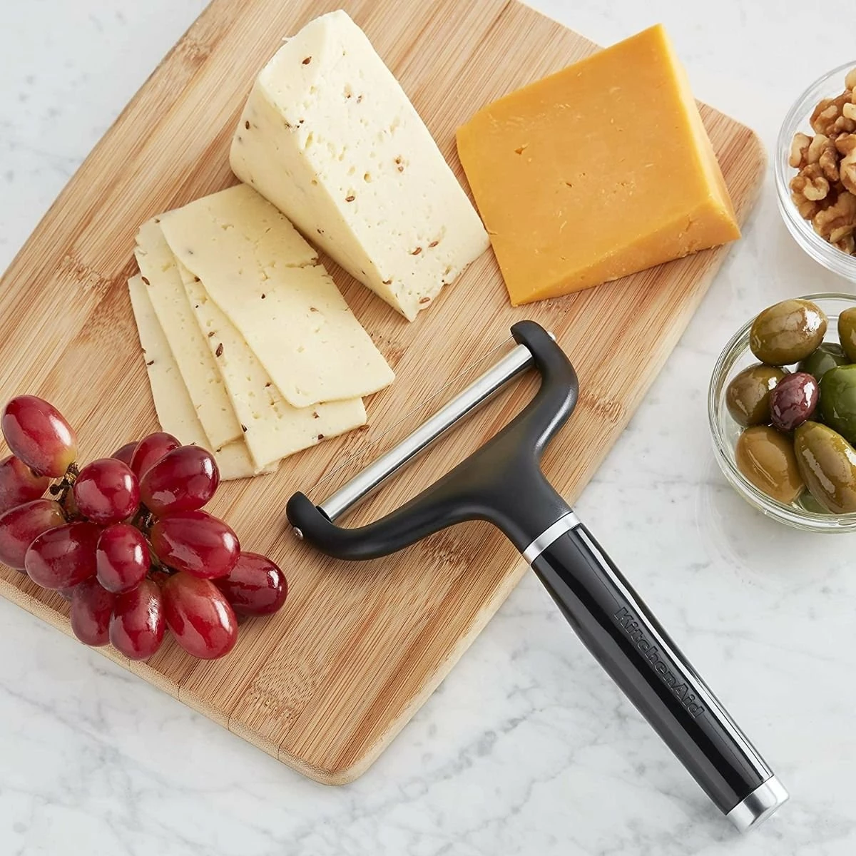Creating a beautiful cheese board has never been easier than with the KitchenAid Classic Cheese Slicer in black. This simple cheese slicer features an ergonomic handle that is easy to use both right and left-handed. The cheese slicer features stainless steel, rust-resistant cutting wire that is perfect for hard and semi-soft cheese. Create a delicious charcuterie board with perfectly even cheese slices, get the KitchenAid Classic Cheese Slicer in black today!Â