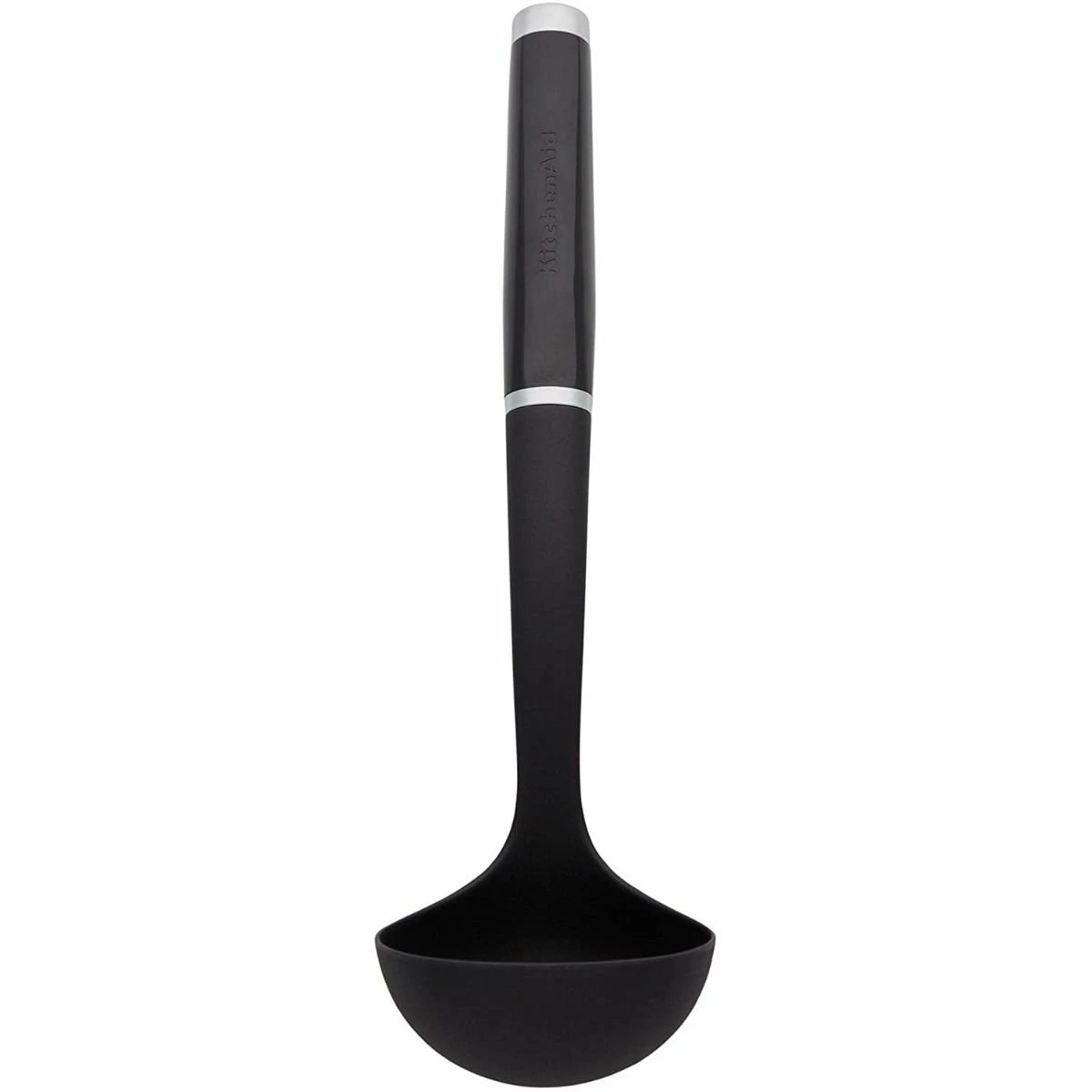 Dish up some delicious homemade soup with ease using the KitchenAid Classic Black Ladle. This nylon ladle is designed with a deep, 3” bowl that allows you to dip larger portions, making it perfect for soup quickly. The nylon construction is heat-safe up to 450°F and features a comfortable handle that is easy to use. The even bowl of the ladle allows you to pour from your right and left hand with equal ease. Add some versatility to your kitchen utensils, get the KitchenAid Classic Ladle in black today!