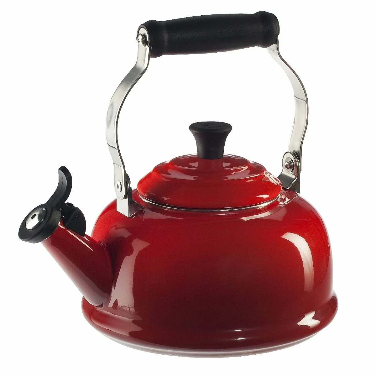 Whether you are preparing a soothing cup of tea, gourmet French press coffee, or a bowl of heartwarming oatmeal, this Le Creuset Classic 1.8 Quart Whistling Kettle in Cerise / Cherry Red will serve your hot water needs in style. This stylish whistling kettle features a single-tone whistle alert when water has reached a rolling boil so you’ll know, even in a different room, when your hot water is ready to pour.