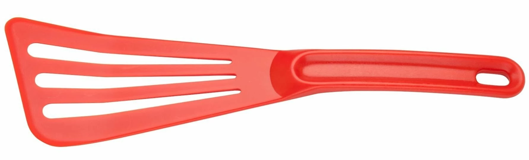In your kitchen you want a slotted spatula that can stand up to the task without damaging your food, ruining your cookware, melting if you leave it in a pan or too close to a burner, or trapping germs from many hands. Meet Mercer Culinary Hell’s Tools High-Heat 12” Slotted Spatula in Red! This commercial-grade spatula is made from a specially formulated glass-reinforced nylon so it can stand up to the heat. The beveled edge gets under food quickly and precisely while the thin, flexible blade is designed to pick up delicate or large items without damage. The seamless design and one-piece construction make this the most sanitary slotted spatula available. Intended for either home or commercial use, this heavy-duty spatula is NSF-certified for safety, performance, and quality; and the many color choices make it ideal for a designated use program or HACCP plan. This slotted spatula is tough enough to survive in Hell’s own kitchen—you’ll definitely want it in yours!