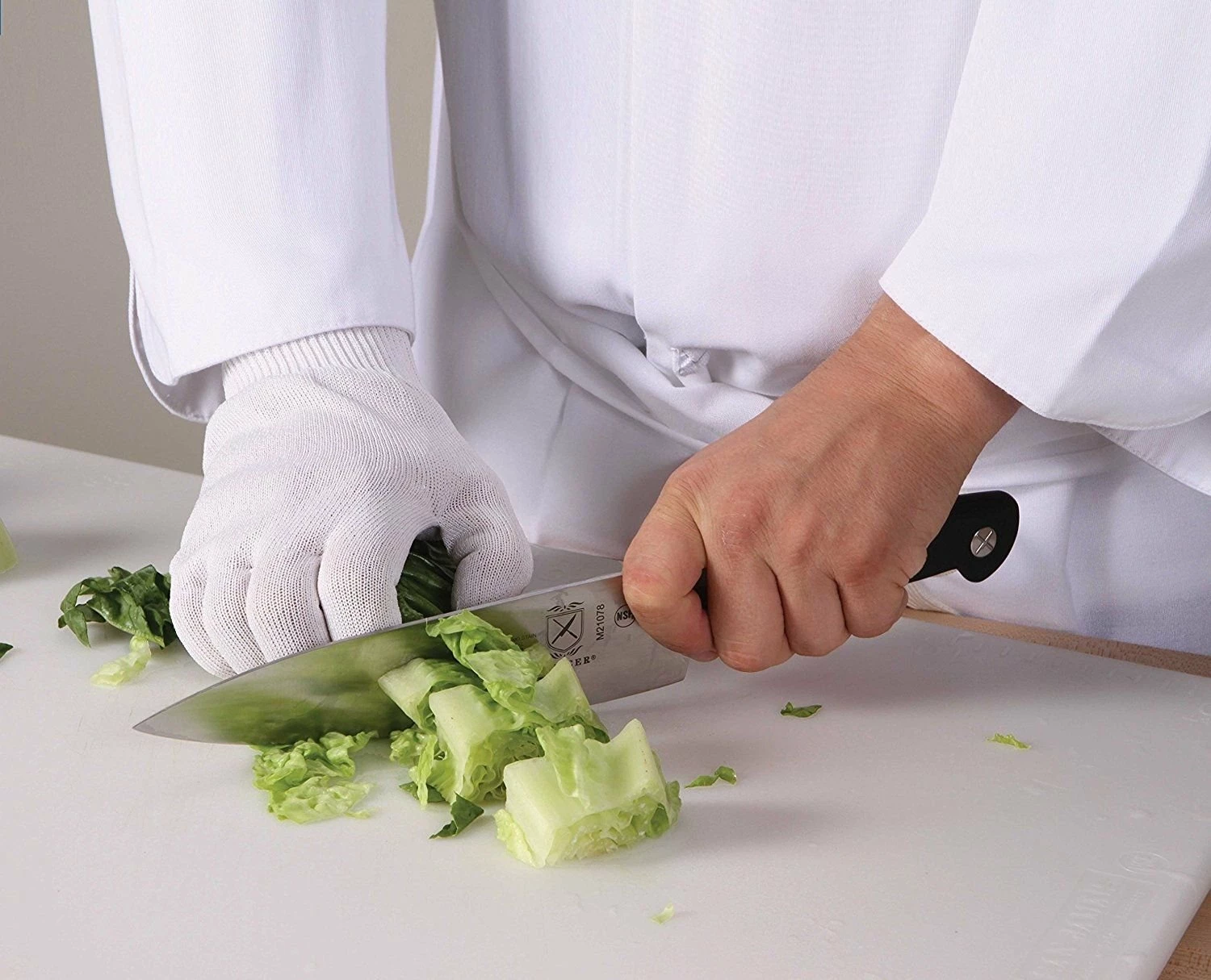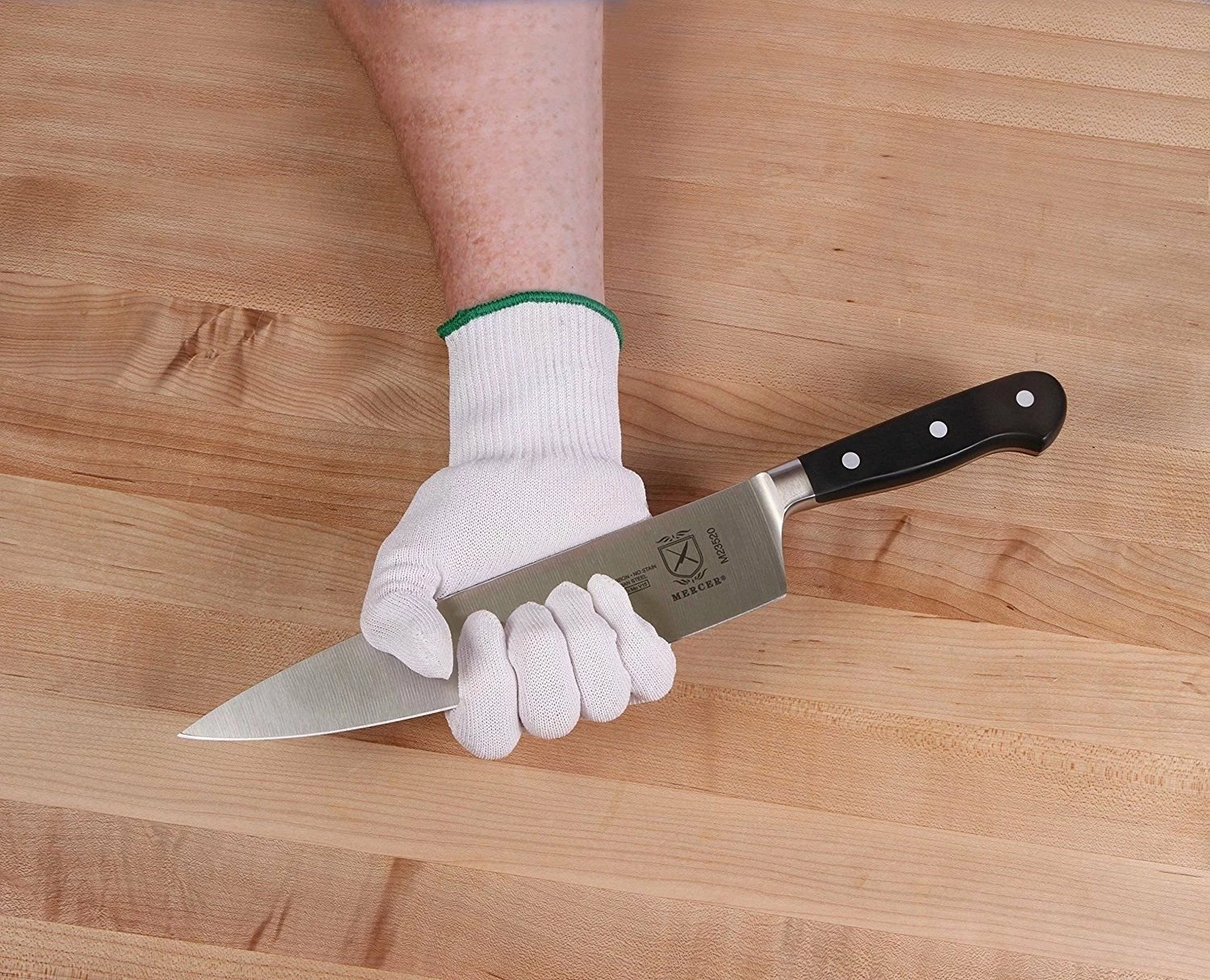 Protect your hands from knife slips with a MercerGuard Cut-Resistant Glove by Mercer Culinary. Available in three sizes, these cut-resistant kitchen gloves are made of lightweight Spectra Fiber and feature ANSI Level A4 cut protection and permanent antimicrobial protection. The gloves are made of FDA-approved material for direct food contact and are washable and bleach-safe for increased sanitation. The MercerGuard Cut-Resistant gloves fit on either right or left hand, and are available in three color-coded sizes: Extra Large, featuring an identifying black cuff (M334111X), Large/White Cuff (M33411L); and Medium/Green Cuff (M33411M).