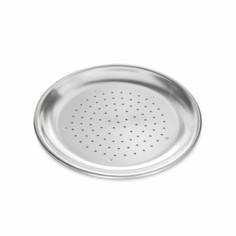 - Small perforations in pan allow hot air to directly hit crust and cook to desired crispness