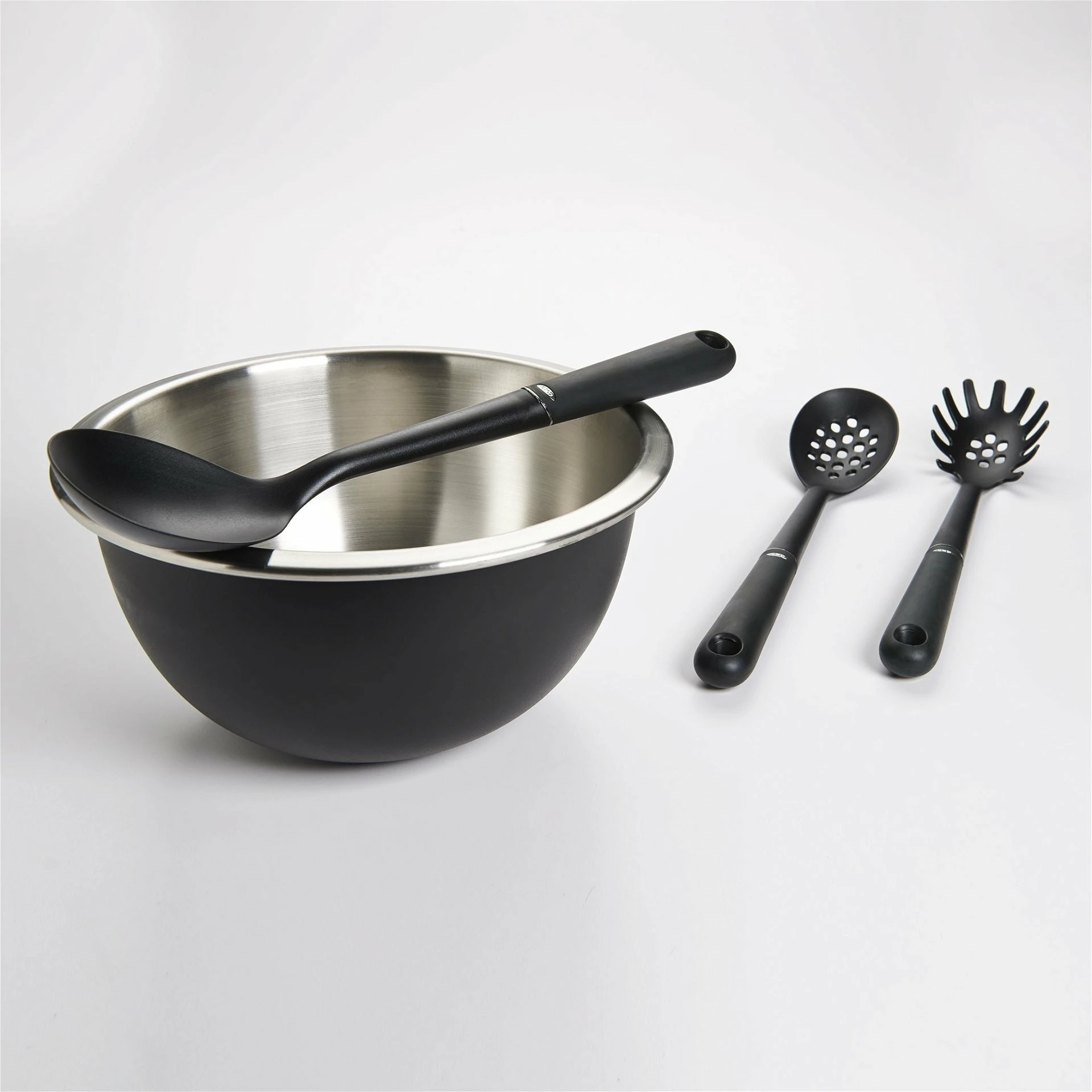Equip your kitchen in a matching set of utensils from OXO. This 4-Piece set of nylon utensils includes a square turner, slotted spoon, serving spoon, and spaghetti server. Each tool is designed with an oversized head, making it easier to use, and a non-slip grip that makes it comfortable to handle. Made from nylon, these utensils are safe for use on non-stick cookware and are heat safe up to 400°F, which adds a great deal of versatility to them. Cook and serve any recipe you can imagine with this set of 4 nylon tools from OXO, get yours today!