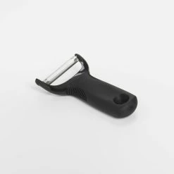 Find out why y-peelers are a chefs’ favorite when you add OXO Good Grips’ Y-Peeler to your kitchen tool chest! Named for its shape and designed for comfort and efficiency, the Y-Peeler has a blade that’s set at a horizontal angle to the handle so your peeling hand remains in a vertical position, instead of the 90-degree angle of a straight peeler. This keeps your hand at a much more comfortable position. Maybe not that big of a deal when you’re peeling one apple, but when you’ve got to peel a 10lb bag of potatoes for a big gathering, you’ll appreciate the difference!