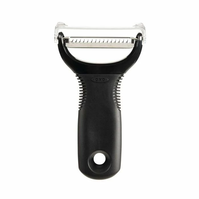 Thin like Julienne! It’s more than like: it is Julienne! With any of your firm fruits or vegetables, professional-style strips fall away with absolute ease with the Good Grips Black Julienne Peeler by OXO. Like with any peeler, simple hold it firm and guide the blade along the edge or surface of those foods, and just like that, you have perfectly cut strips in julienne. Along the side of the black peeler, you’ll see ribbed or contoured flaps designed for absolute comfort as you peel smooth, straight edges or rough, bumpy edges. There’s no need to learn to cut like a professional chef, not with a tool like this peeler; and with such convenience, you have the opportunity for creating delicious garnishes, salad toppings, and so much more. Just take the peeler by the soft, non-slip grip, flip the cover out of the way, and then you can start peeling away. And once you’re all done, just flip the cover back to where it belongs for easy storage. Cleaning is no different – just wipe and rinse. Some days, you just want to eat out; other days, you just want to eat in. Well, eat in with OXO’s Good Grips Black Julienne Peeler, for nothing even compares to the homemade tastes and aromas of freshly made food by your own two hands.