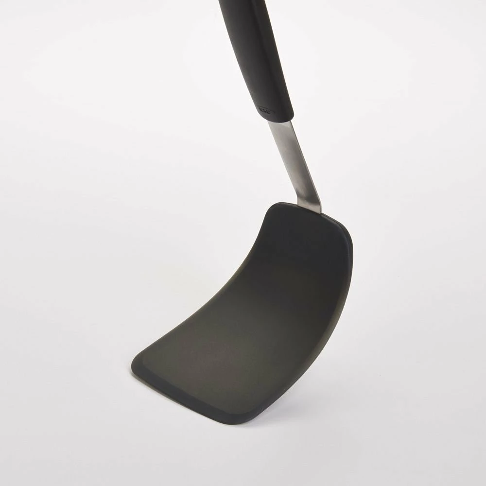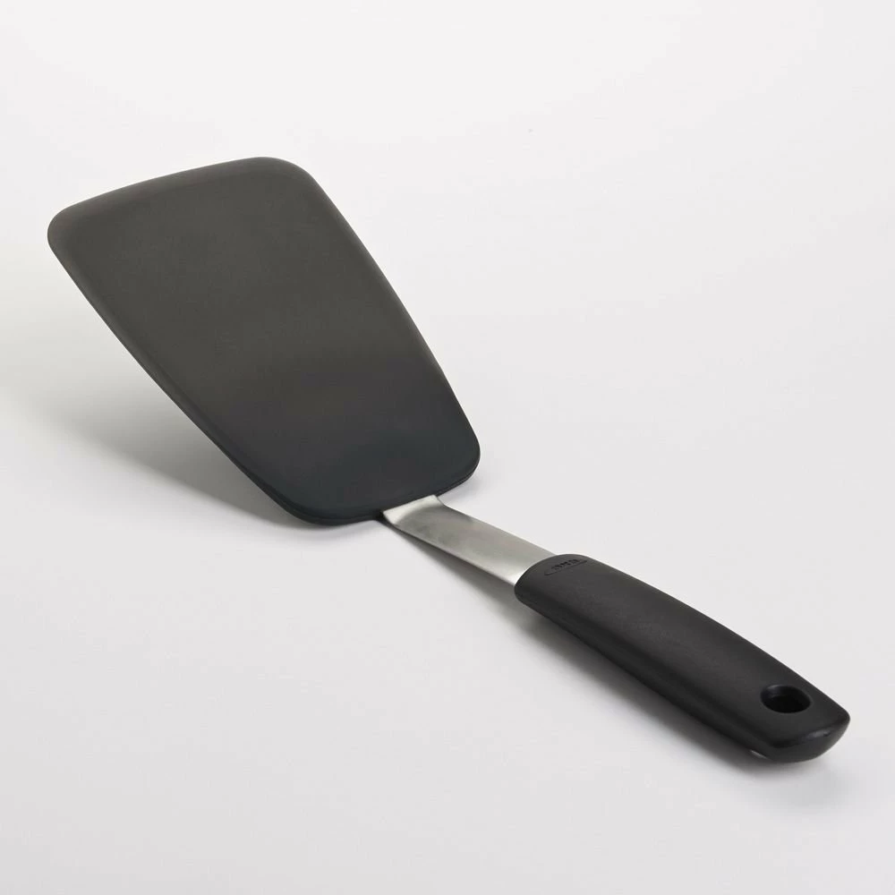 Remove the challenge of flipping grilled sandwiches or burgers with OXO’s large flexible silicone turner and score points in taste and presentation. The OXO’s thin edge makes getting underneath foods simple and assists flipping or turning soft or delicate foods. The stainless steel body is flexible, coated with comfortable and soft silicone, and heat resistant up to 600 F. Make turning your most delicate foods simple with an OXO flexible silicone turner.