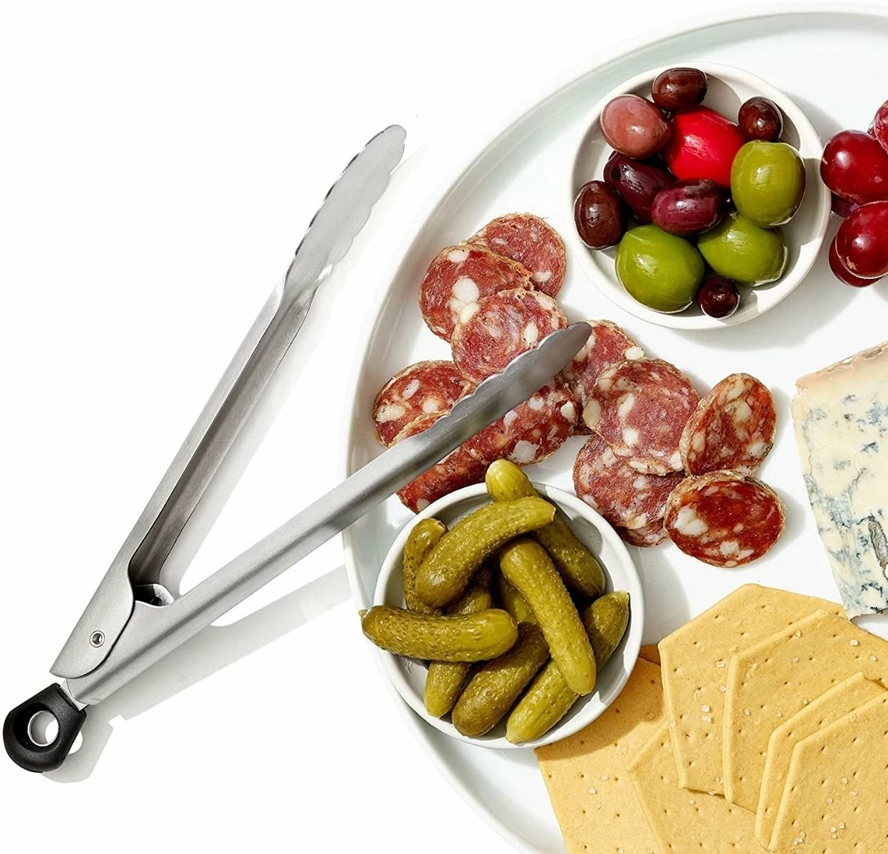 Serve appetizers in style with the OXO Mini Tongs. These tongs are made from stainless steel so they are as durable as their full-sized counterparts. The heads of the tongs are scalloped to grip food securely, making them great for taking food out of jars and cans. To make storing the tongs easy, they have a locking mechanism and have the option for hanging storage to make your life easier. Enjoy a lavish charcuterie board or make grabbing your pickles a little easier, get the OXO Mini Tongs today!Â