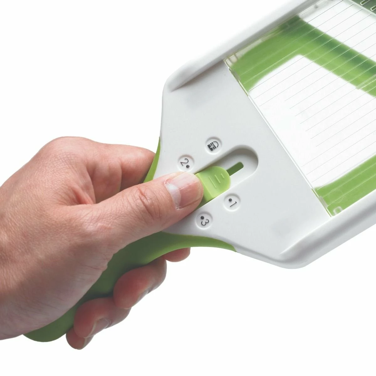 The Progressive International Julienne and Slicer has three slicing thicknesses that can be easily adjusted with your thumb. This slicer can easily transform from slicing to julienne blades. The wide surface of the julienne and slicer accommodates larger fruits and vegetables with ease. The angle of the stainless steel blade provides more efficient slicing and the non-skid ridged surface provides needed stability when using this julienne and slicer over a bowl or on a counter. There is a safety lock for storage of this julienne and slicer and a protective finger guard while in use.