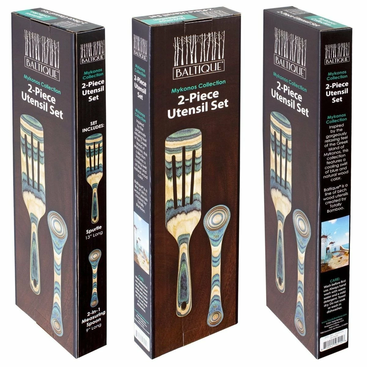 Both of these utensils are made with sturdy, layered birch wood, providing both a gorgeous color pattern evoking the beauty of the Greek island of Mykonos, and high durability. This birch wood construction is much more environmentally friendly than plastics and other synthetic materials. The 9″ measuring spoon is double-ended, with both a teaspoon and tablespoon measuring bowl, which is perfect for both cooking and baking when your measurements must be exact! The Totally Bamboo 13″ spurtle is a tool designed for efficiency and versatility in the kitchen. It works great as a spatula for flipping and serving, but is also great at mixing and mashing, and is long enough to reach deep down into your cookware and bakeware without endangering your hands. Both utensils feature long, slim, round handles that provide a comfortable grip. The wooden construction of these utensils are durable, but are safe to use with nonstick cookware without risk of damaging the nonstick coating. It is recommended to hand wash these utensils or wipe with a damp cloth; they should not be soaked or placed in a dishwasher.