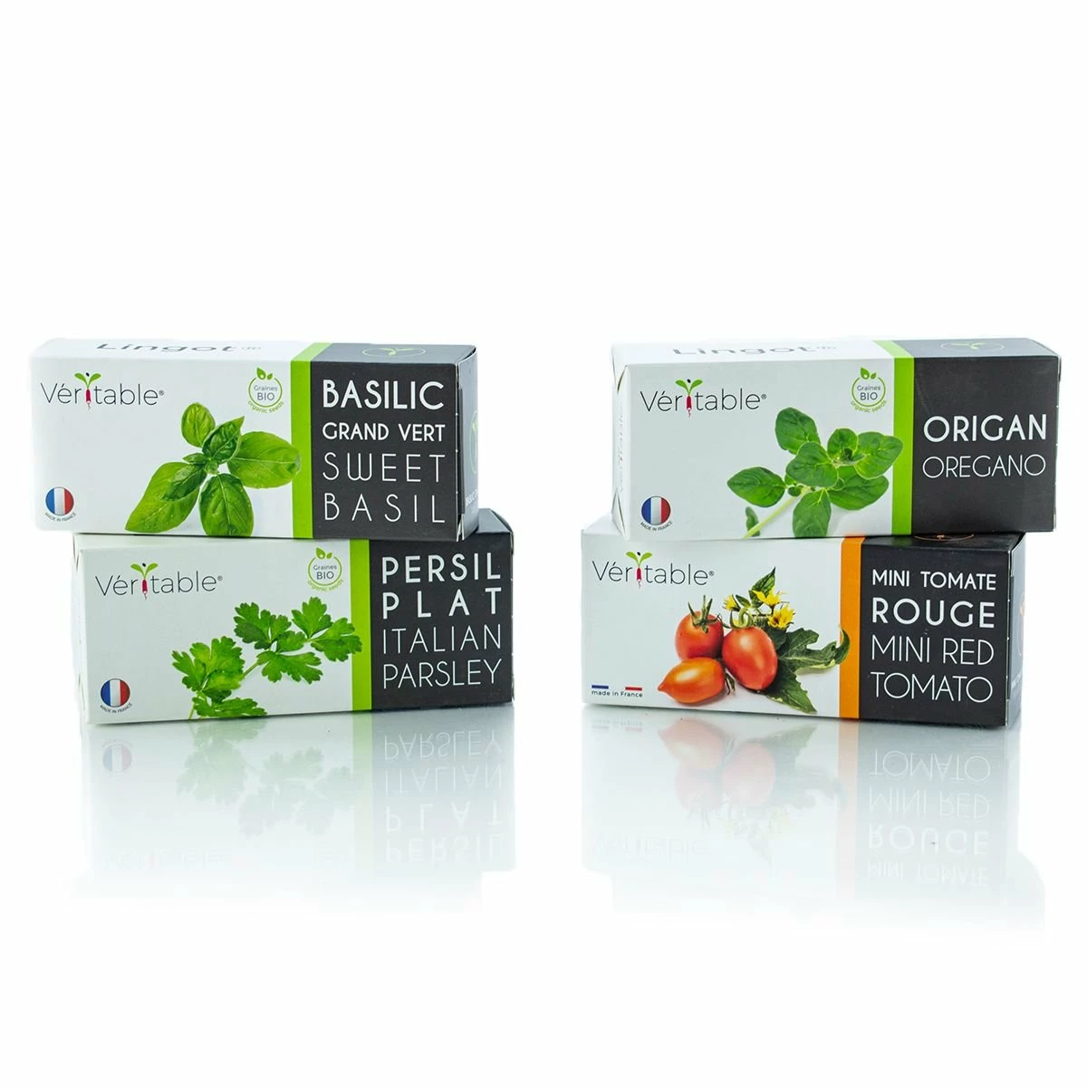 Whether you’re the type of person who has always been able to tend to an abundant garden year after year or the type of person who has the ability to kill even fake plants, the Veritable® indoor garden systems allow you to grow & harvest fresh herbs, fruits & vegetables all year long from the stable environment in your home. These garden systems use unique ready-to-use seeds called “lingots” which are optimally spaced & placed at the right depths. The lingots are 100% natural & free of any chemicals, pesticides or GMO’s. The Veritable® Lingot Seed Pods (Italian Collection) includes all of the lingots you need to add fresh Italian-style flavors to your meals or harvest your fresh grown herbs & produce for homemade pesto or caprese salad. Lingots included in the Italian Herb Collection are Organic Sweet Basil, Organic Flat/Italian Parsley, Organic Oregano & Organic Mini Red Tomato.